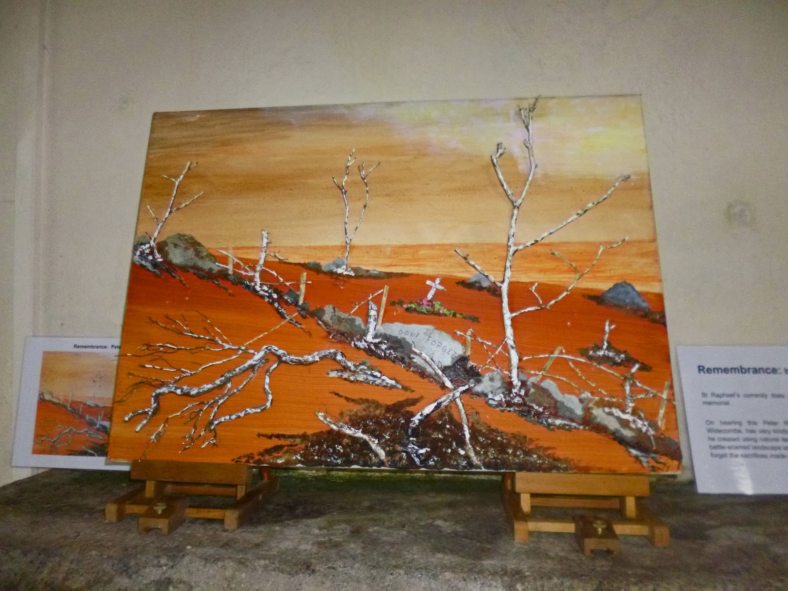 I was interested to see on the lovely old granite fireplace, a fabulous collage which had been created by a local artist after hearing that St. Raphael`s didn`t have a war memorial.