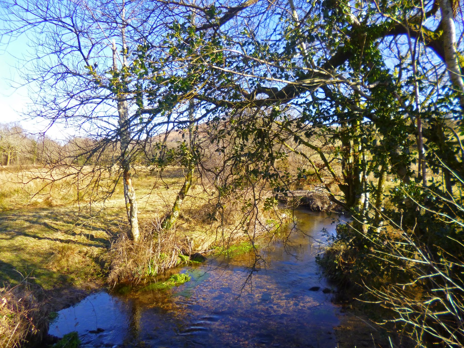Putting aside fanciful thoughts we drove on down the steep hill between shrubby gorse bushes sprinkled with golden flowers and stopped at Huccaby bridge, a rather lovely old pack horse bridge which the West Dart river meandered sleepily under.